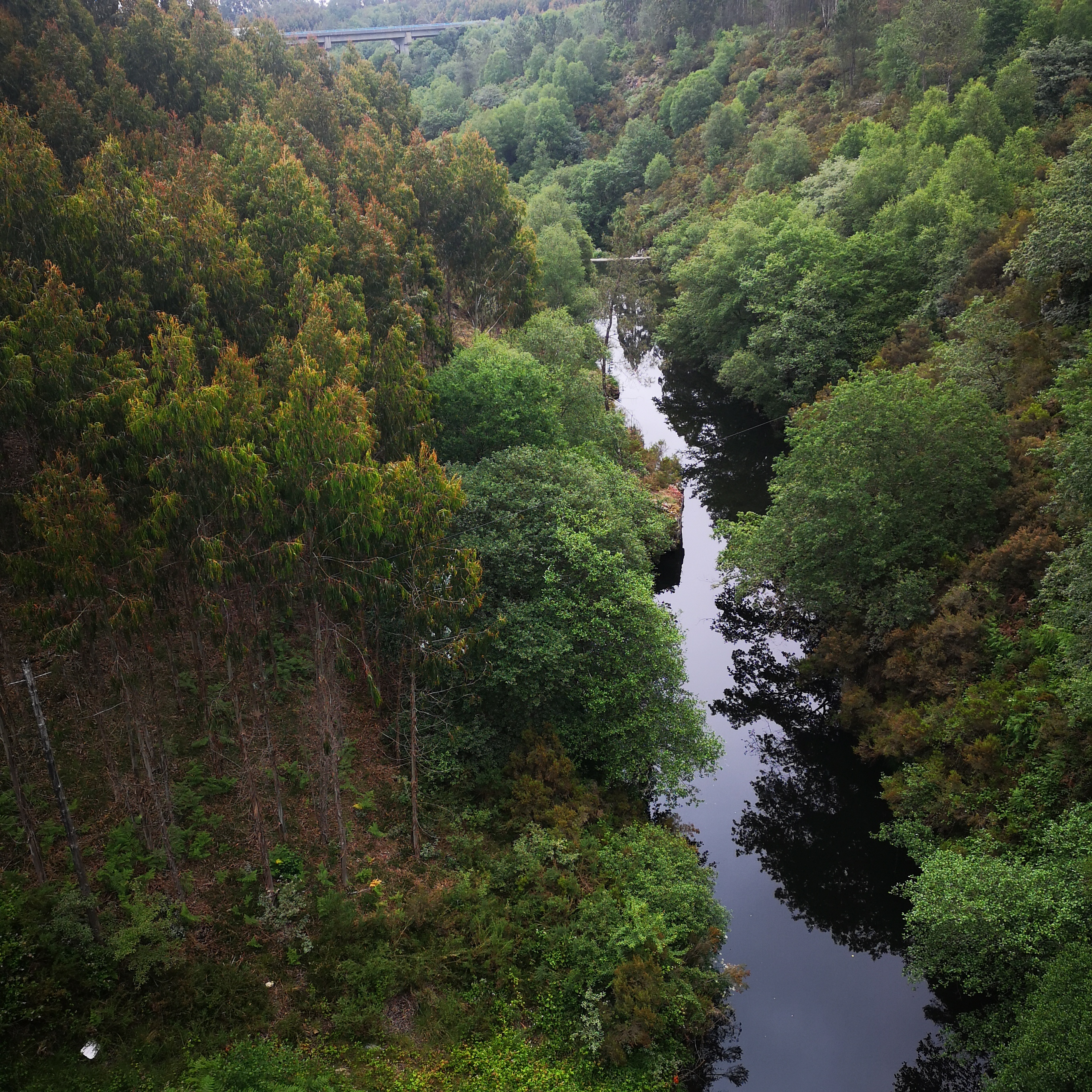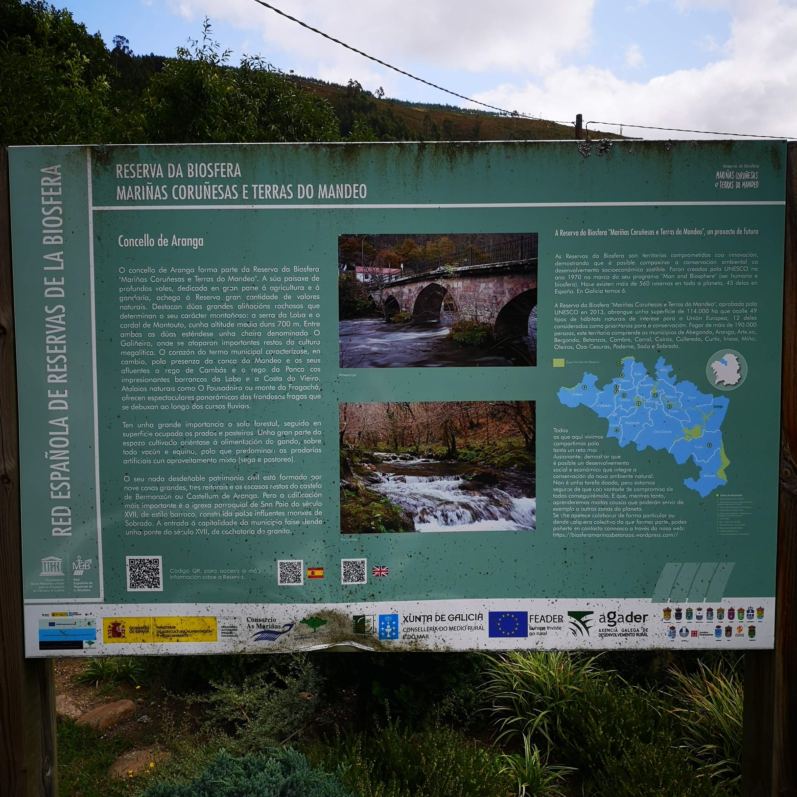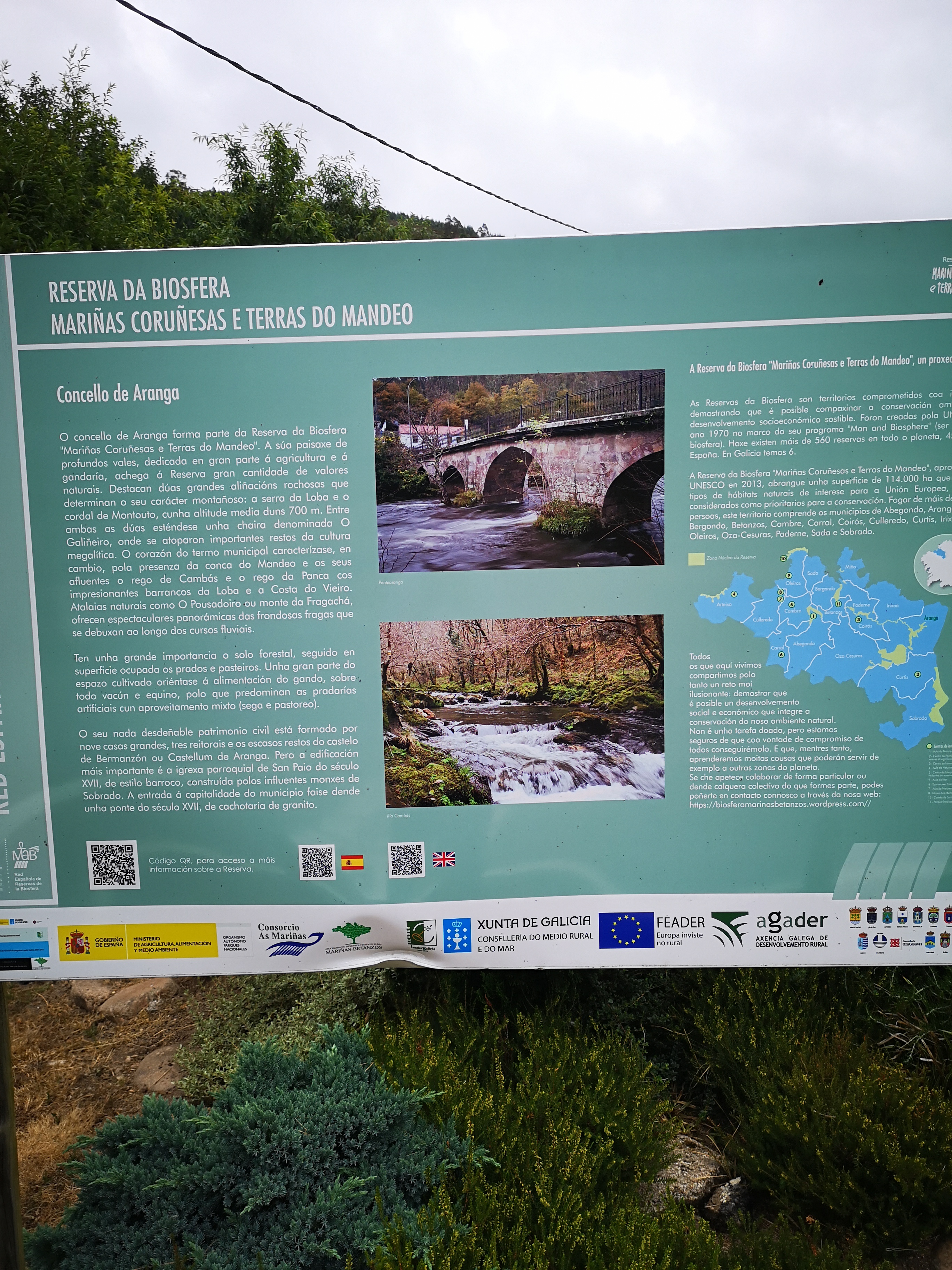 En realidade hai tres pontes que cruzan o río Mandeo, a do século XVIII, máis abaixo, a dos anos 50, no medio e a ponte da A6, polas alturas. A mellora das estradas "linealizandoas"( aprovéitase así a inercia do coche) fai que cada vez sexan máis outas e longas as pontes. Non baixan e suben, continuan dun extremo ao outro.